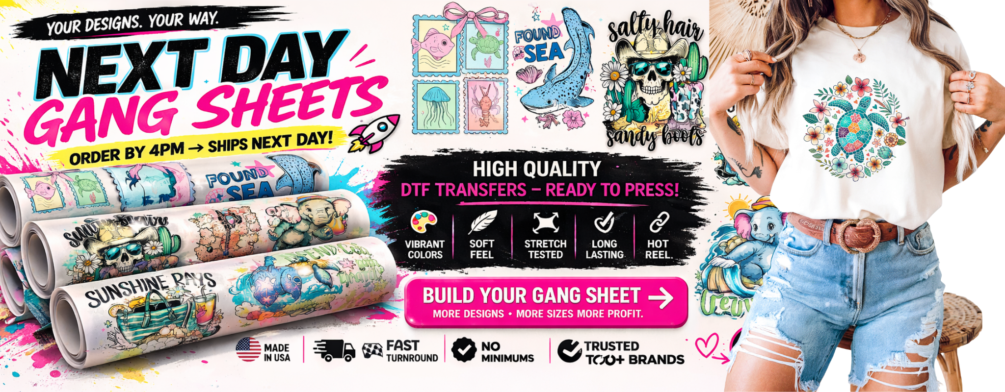 I ordered a few gang sheets using the gang sheet builder on a Friday around 2pm and it was delivered on Sat before noon! AWESOME service!