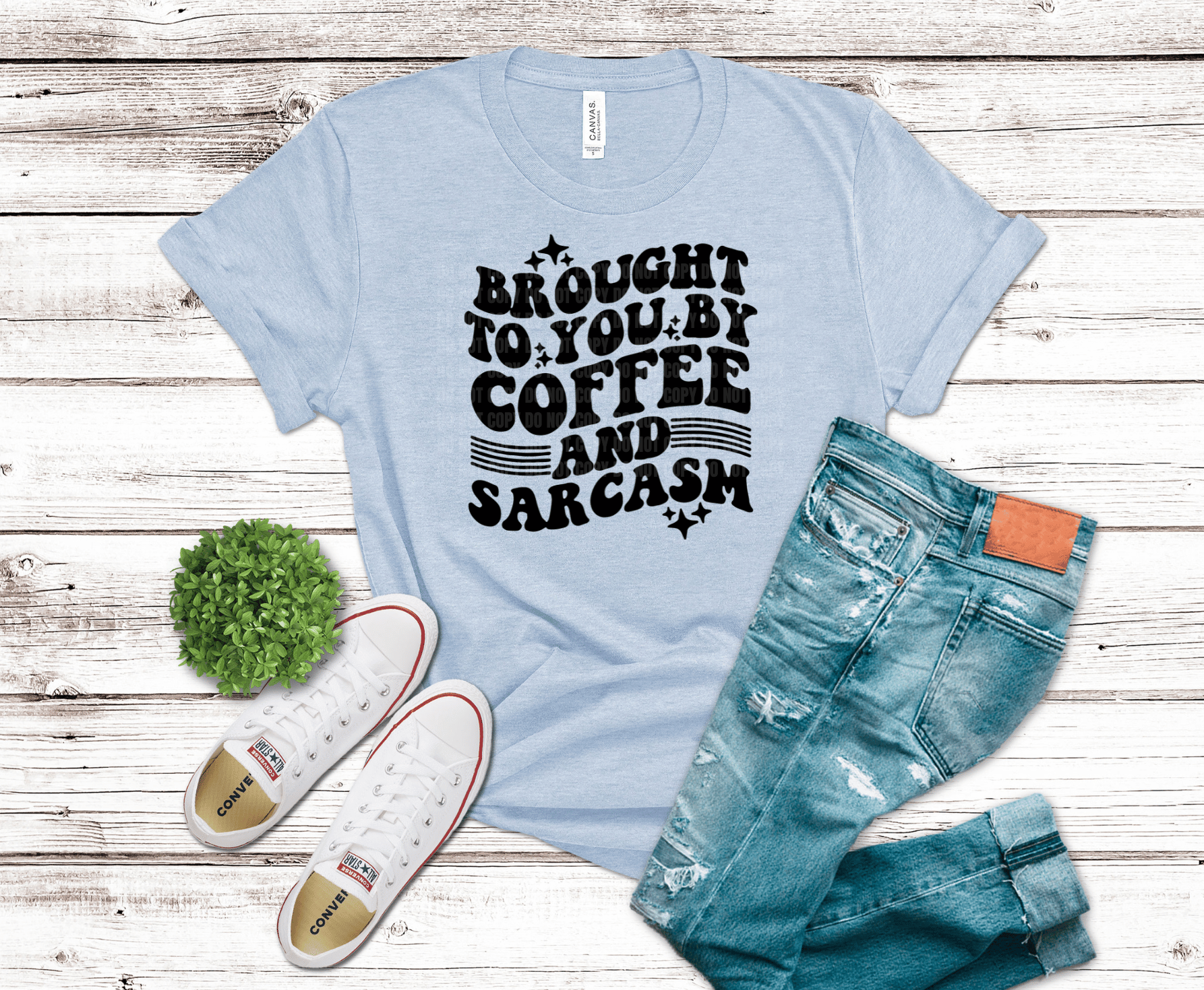 Coffee and Sarcasm by Griffin Expressions is a fun direct to film transfer that can be placed on a variety of clothing!