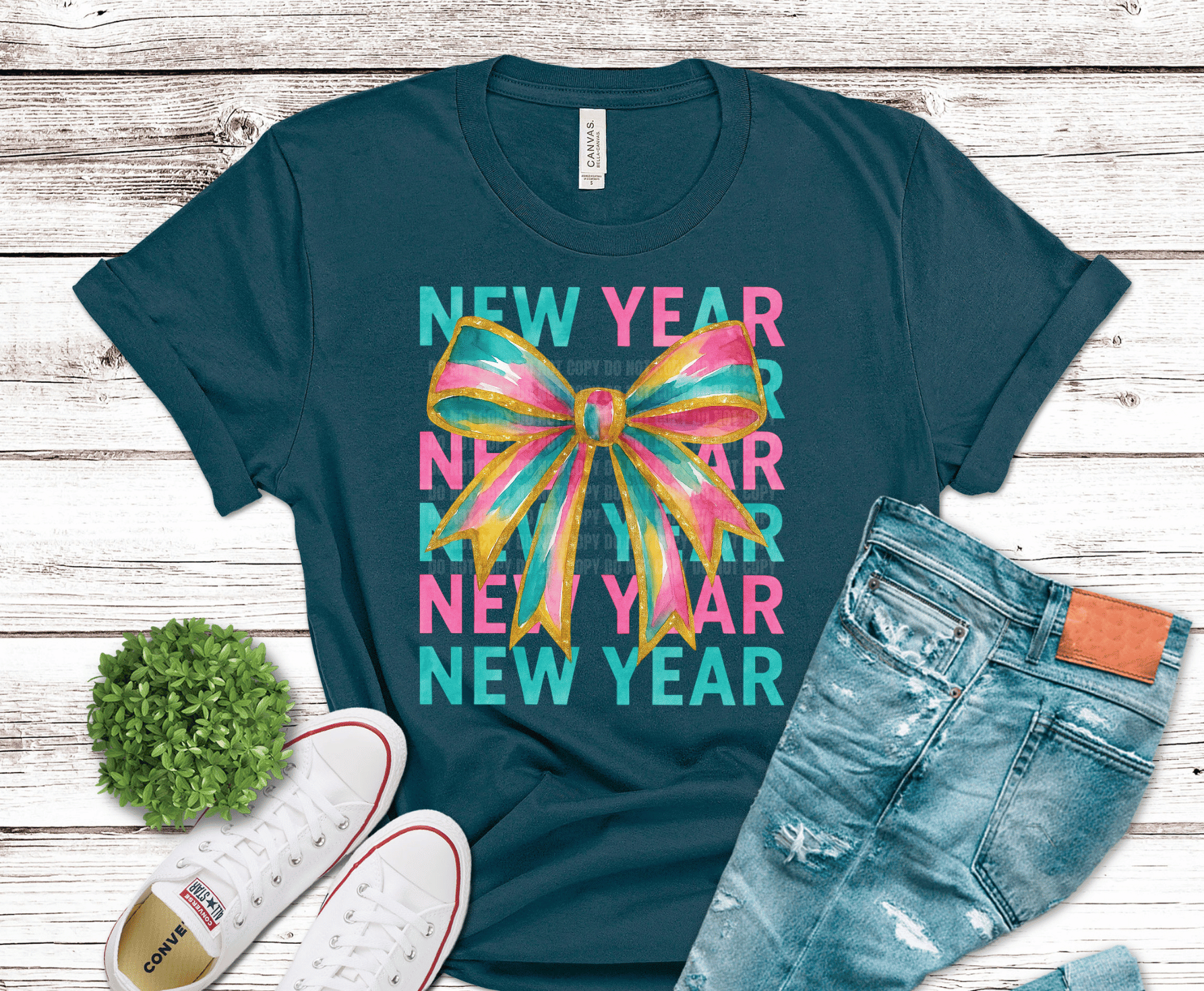 Colorful New Years Bow DTF Heat Transfer from Griffin Expressions brings playful seasonal energy to your apparel. This vibrant, ready-to-press custom DTF transfer is perfect for shirts, hoodies, and more.