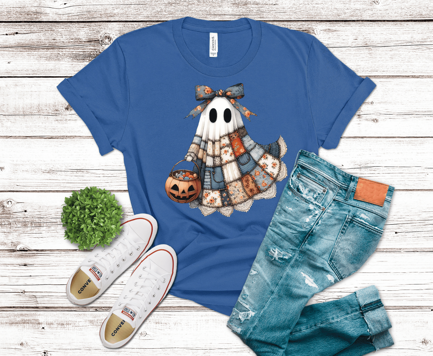 Patchwork Ghost DTF Heat Transfer from Griffin Expressions brings playful seasonal energy to your apparel. This vibrant, ready-to-press custom DTF transfer is perfect for shirts, hoodies, and more.