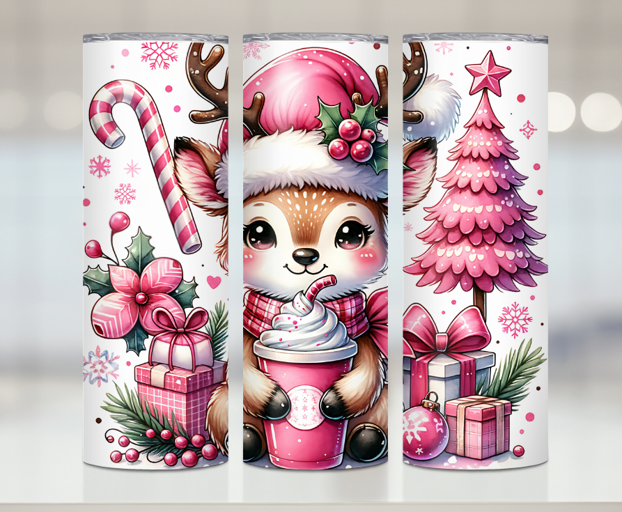 Pink Coffee Reindeer | Premium Sublimation Tumbler Transfers – Vibrant, Long-Lasting Designs