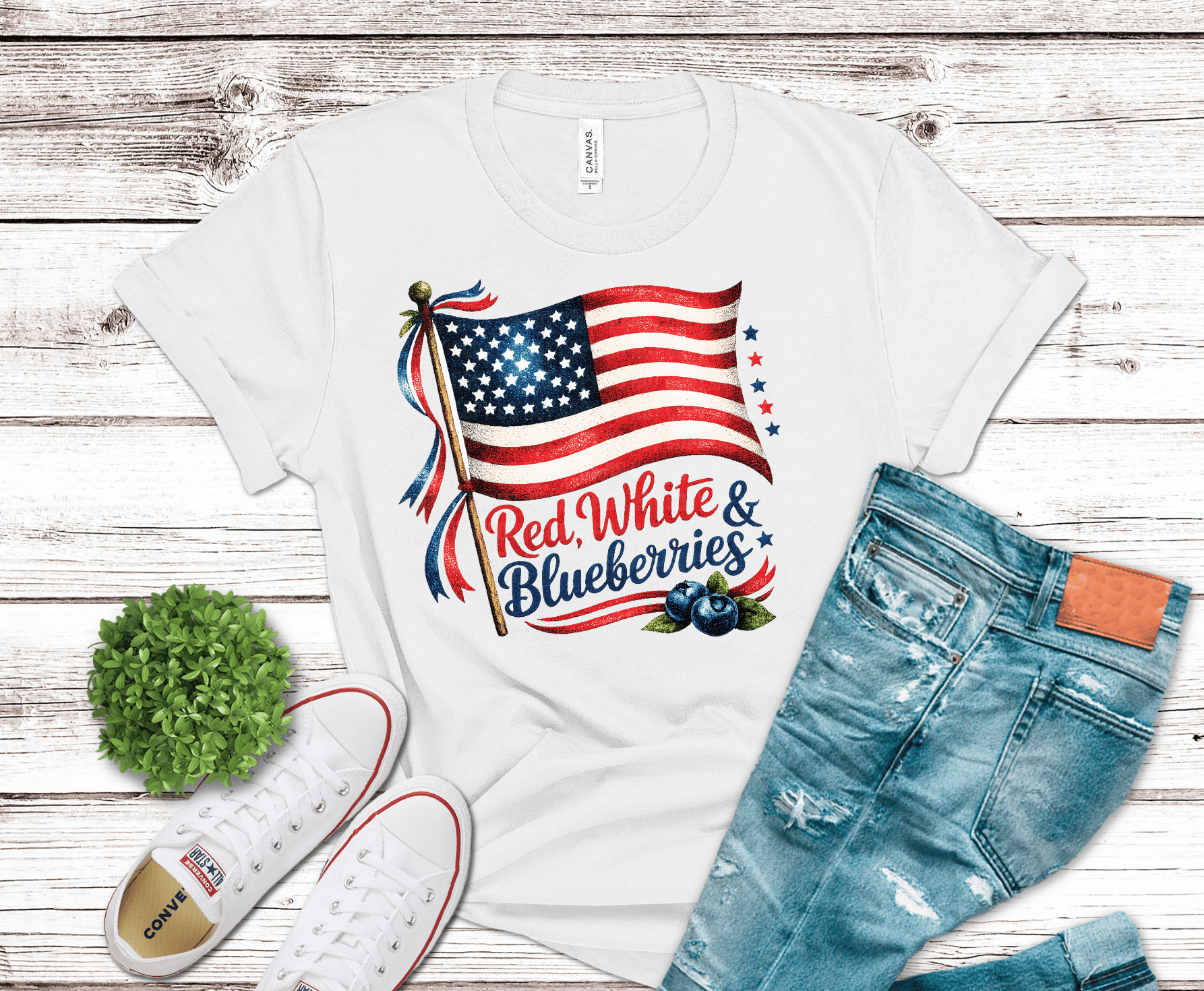 Red, White, Blueberries Flag and Ribbon DTF Heat Transfer from Griffin Expressions. This vibrant, ready-to-press custom DTF transfer is perfect for shirts, hoodies, and more.